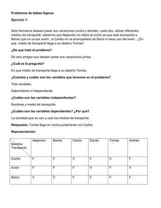 Este documento presenta cinco ejercicios de problemas lógicos resueltos por un grupo de estudiantes. Los ejercicios involucran tablas lógicas, diagramas de flujo, relaciones familiares y extracción de dulces de una caja. Para cada ejercicio, el documento describe el problema, identifica las variables, proporciona la solución y una representación gráfica. El objetivo parece ser mostrar diferentes enfoques para resolver problemas lógicos de manera sistemática.