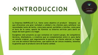 La empresa Marvelluz S.A. se dedica a la fabricación y comercialización de lámparas decorativas. Su misión es ofrecer productos de alta calidad que brinden elegancia y armonía al hogar. El proyecto es llevado a cabo por un grupo de estudiantes con conocimientos complementarios en diseño, técnica y creatividad. Marvelluz planea expandirse a nivel nacional en los próximos dos años y convertirse en líder del mercado de lámparas decorativas en Ecuador.