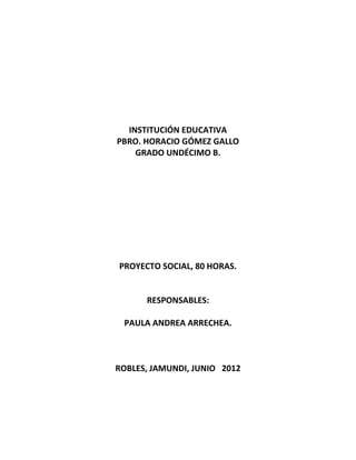 Este documento describe un proyecto de servicio social estudiantil de 80 horas en la Institución Educativa Presbítero Horacio Gómez Gallo. El proyecto busca fortalecer valores como la responsabilidad y la solidaridad mediante actividades que beneficien a la comunidad, especialmente en la Loma de la Cruz. Los objetivos incluyen sensibilizar a los estudiantes sobre las necesidades de la comunidad, articular acciones educativas con otras organizaciones, y aplicar conocimientos para desarrollar proyectos. Algunos campos de acción propuestos