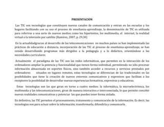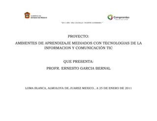 Este documento presenta un proyecto para implementar el uso de tecnologías de la información y la comunicación (TIC) en el aula de una escuela primaria multigrado en México. El proyecto busca mejorar el aprendizaje de los estudiantes mediante el uso de computadoras, internet, audiovisuales y otras herramientas TIC. El profesor jugará un papel de facilitador para diseñar estrategias de enseñanza que incorporen las nuevas tecnologías de manera significativa.