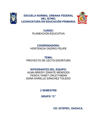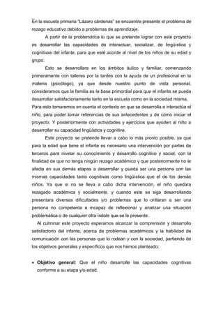 Este documento describe un proyecto para desarrollar las habilidades de lectoescritura y lenguaje de un niño que presenta rezago educativo debido a problemas de aprendizaje. El proyecto consiste en una serie de talleres con el niño, sus padres y maestra para trabajar en el desarrollo cognitivo y lingüístico del niño a través de ejercicios de respiración, absorción, relajación, soplo y fonética. El proyecto se llevará a cabo durante dos meses con la colaboración de un