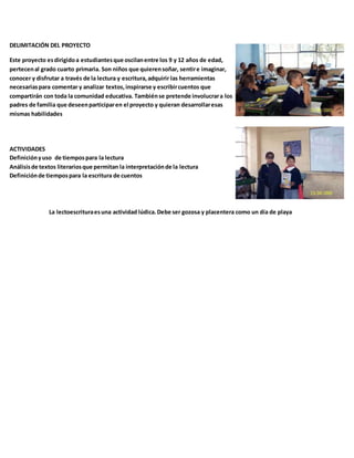Este proyecto busca mejorar los procesos de lectoescritura en niños de 9 a 12 años a través de la lectura y creación de cuentos. Sus objetivos son fomentar los hábitos de lectura compartida, formar lectores críticos que puedan plasmar sus pensamientos y emociones en palabras, y utilizar la lectura y escritura para comunicarse y construir textos propios. Se justifica por la necesidad de fortalecer estas habilidades como elemento facilitador del aprendizaje, y porque ayuda a los niños a expresarse y rel