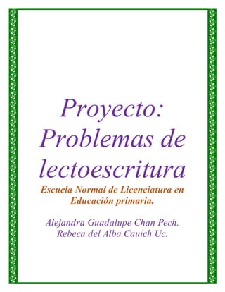 Este documento describe un proyecto para abordar problemas de lectoescritura en un grupo de sexto grado en una escuela primaria en Hopelchén, Campeche. El proyecto será implementado por dos maestras practicantes y se enfocará en mejorar las habilidades de lectura y escritura de los estudiantes a través de actividades didácticas y lúdicas. El documento analiza el contexto socioeducativo de la escuela y los sujetos involucrados, y provee fundamentos teóricos sobre la importancia de la lectoescritura y sus