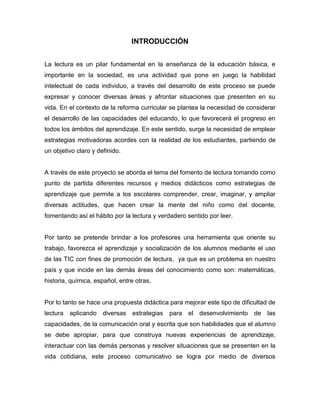El documento presenta un proyecto educativo que busca fomentar el gusto por la lectura en alumnos de segundo grado, utilizando diversas estrategias didácticas y recursos tecnológicos, como videos y audiocuentos. Se plantea un diagnóstico inicial para conocer los intereses de los estudiantes y se implementarán actividades lúdicas para integrar a la comunidad educativa en el proceso. Se enfatiza la importancia de la lectura como herramienta fundamental para el desarrollo integral y se proponen objetivos claros para mejorar los hábitos de lectura y el rendimiento escolar.