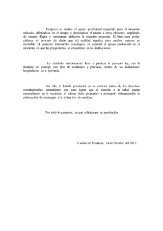 Este documento propone una ley para proteger los derechos de las mujeres que sufren abortos espontáneos o la muerte de un recién nacido en el hospital. Actualmente, estas mujeres reciben poca asistencia y apoyo emocional. La ley requeriría que los hospitales brinden habitaciones privadas y grupos de apoyo especializados, y respeten los derechos de las mujeres a la intimidad y la toma de decisiones informadas. El objetivo es corregir las prácticas insatisfactorias y brindar una mejor atención a mujeres en situaciones tan