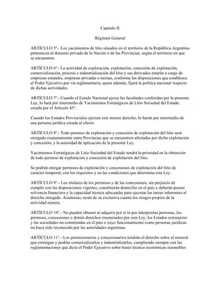 Este proyecto de ley establece un régimen legal para la exploración, explotación, comercialización e industrialización del litio y sus derivados en Argentina. Se declara al litio como un recurso estratégico y se crea la Comisión Nacional de Explotación del Litio para regular y fiscalizar las actividades relacionadas con el litio. El proyecto también establece las funciones y financiamiento de la Comisión, así como los permisos, concesiones y participación provincial en la explotación de litio.