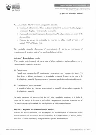 Este documento propone una ley que crea un procedimiento de desalojo notarial con asistencia de la fuerza pública. El proceso permitiría a los propietarios desalojar inquilinos morosos o cuyos contratos han expirado de manera más rápida a través de un trámite notarial. El proyecto de ley establece los requisitos para los contratos de arrendamiento, los pasos del proceso notarial de desalojo incluyendo notificaciones y plazos, y el rol de la policía para ejecutar el desalojo si
