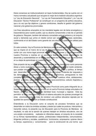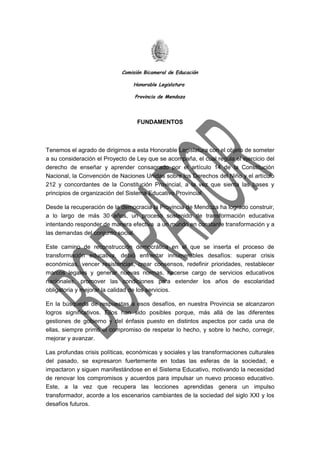El documento presenta un proyecto de ley de educación para la provincia de Mendoza. Explica que desde la recuperación de la democracia, Mendoza ha logrado construir un proceso sostenido de transformación educativa para responder a un mundo en constante cambio. El proyecto de ley busca establecer los principios y organización del sistema educativo provincial de acuerdo a la constitución nacional, tratados internacionales y la constitución y leyes educativas de Mendoza, con el fin de garantizar el derecho a la educación y formación integral