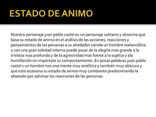 El documento describe al personaje Juan Pablo Castel como un hombre solitario y obsesivo que basa su estado de ánimo en analizar a los demás. Castel puede pasar rápidamente de la alegría a la tristeza debido a su mente analítica y oscura. La obra literaria de 1948 "El Túnel" de Ernesto Sábato explora la psicología de los personajes y cómo la obsesión puede llevar a cometer crímenes. La novela se desarrolla en Buenos Aires en 1946 y trata sobre la incomunicación y cómo el amor