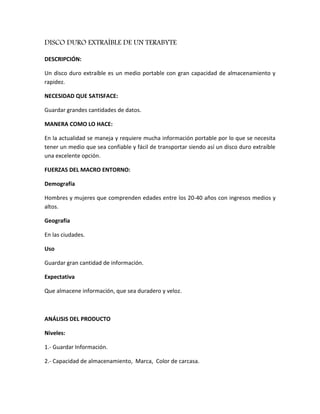 Este documento presenta un análisis de la estrategia del mix de marketing para un disco duro extraíble de 1 terabyte. Incluye una descripción del producto, las necesidades que satisface, un análisis del macroentorno, un análisis del producto, su ciclo de vida, un análisis de precios de la competencia, los canales de comercialización utilizados, formas promocionales y una propuesta para una nueva mezcla de marketing.
