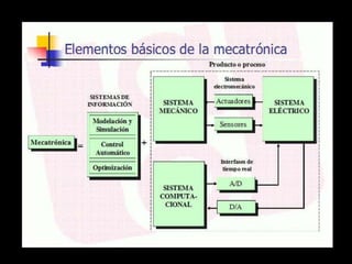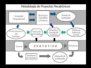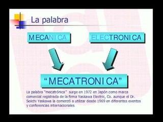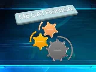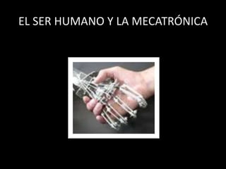 Este documento describe la mecatrónica y su relación con el ser humano. La mecatrónica es la integración multidisciplinaria de la mecánica, electrónica, informática y control en el diseño de sistemas de manufactura y productos. Incluye la robótica, que usa la inteligencia artificial para emular el comportamiento humano. También presenta ejemplos de aplicaciones de la mecatrónica en la industria automotriz y la salud.