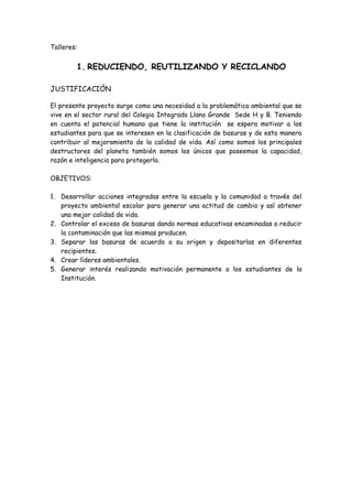 Este proyecto transversal del Colegio Integrado Llano Grande tiene como objetivo crear conciencia ambiental en los estudiantes sobre temas como la contaminación, el reciclaje y la importancia de cuidar el medio ambiente. El proyecto abarcará diferentes áreas como ciencias naturales, lenguaje, matemáticas e incluirá talleres prácticos sobre reducir, reutilizar y reciclar basura. Los estudiantes aprenderán a clasificar los desechos y participar en acciones que ayuden a conservar el medio ambiente.