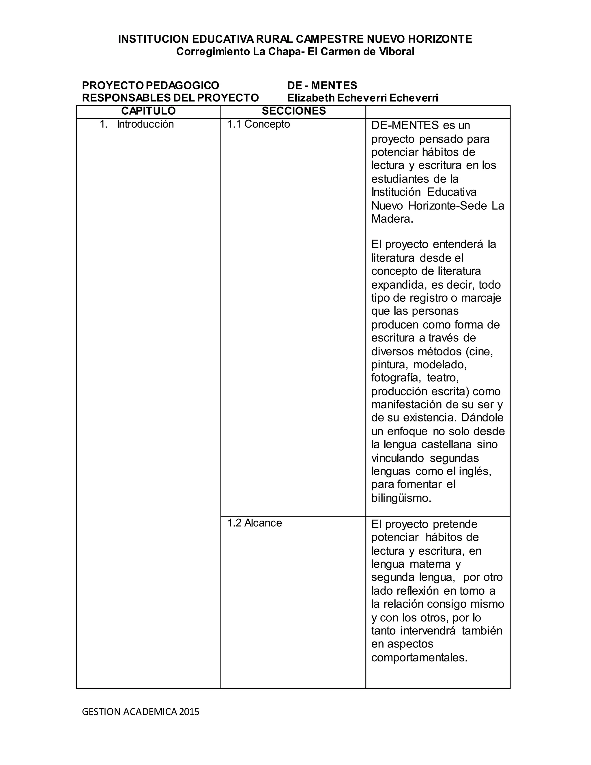 El proyecto DE-MENTES tiene como objetivo principal potenciar los hábitos de lectura y escritura en los estudiantes de la Institución Educativa Nuevo Horizonte mediante diferentes estrategias como encuadres literarios en clase, lecturas semanales, centros literarios, un grupo de teatro y talleres de fotografía y creación literaria, con el fin de mejorar los resultados académicos y las pruebas estatales.
