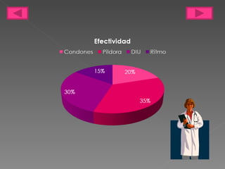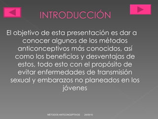 Este documento presenta una descripción general de varios métodos anticonceptivos, incluyendo métodos de barrera, hormonales, quirúrgicos y naturales. Explica los tipos de cada método, cómo funcionan, su efectividad para prevenir embarazos y enfermedades de transmisión sexual, y factores a considerar al elegir un método.