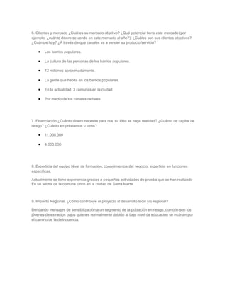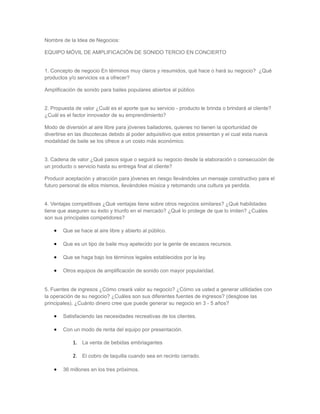 Este documento describe una propuesta de negocio para ofrecer servicios de amplificación de sonido para bailes populares al aire libre. El negocio busca proveer entretenimiento a bajo costo para jóvenes de bajos recursos y transmitirles mensajes positivos. El negocio generaría ingresos a través del alquiler de equipos, venta de bebidas y taquilla para eventos cerrados. Apunta a mercados populares en 3 comunas y requiere $11 millones en financiamiento, $4 millones como capital de riesgo.