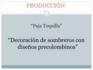 Este documento describe un proyecto para decorar sombreros de paja toquilla ecuatorianos con diseños precolombinos. Actualmente, los sombreros de paja toquilla se exportan principalmente a Europa y Estados Unidos y se usan modelos como el Fedora Clásico, Golfer y Borsalino. El proyecto busca promover el uso de estos sombreros entre los jóvenes mediante la marca "Primitiva" y diseños inspirados en culturas como Jama-Coaque y Tolita para conectar con las raíces ecuatorianas