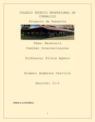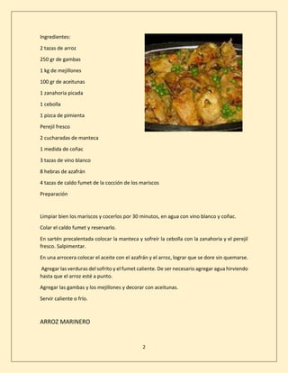 El documento presenta varias recetas de comidas internacionales. La primera receta es para arroz a la española, que incluye gambas, mejillones, aceitunas y otros ingredientes cocinados en vino y caldo. La segunda receta es para arroz marinero con mariscos y vinagreta. La tercera receta es para arroz al caldero cocinado con pescado, tomate y ajo.