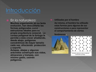 Este documento presenta información sobre polígonos regulares. Explica que muchos organismos usan formas poligonales en su arquitectura corporal y construcción de nidos debido a que minimizan el gasto de recursos. También señala que los humanos han utilizado polígonos para algunas construcciones y para representar fenómenos. A continuación, proporciona objetivos de aprendizaje sobre polígonos regulares e introduce conceptos clave como vértices, lados, centro, radio y apotema. Finalmente, plantea un ejercicio práct