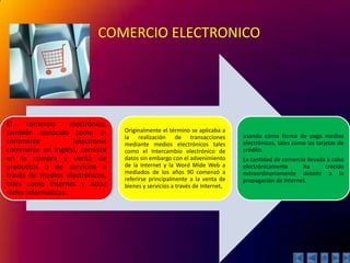 El documento presenta información sobre el origen y evolución histórica del comercio electrónico, destacando que surgió en los últimos decenios del siglo XIX con la venta por catálogo y evolucionó a mediados de los 80 con la venta directa por televisión. Luego describe brevemente las ventajas del comercio electrónico para las empresas y los usuarios, así como sus usos principales como la creación de nuevos canales de marketing y ventas o el soporte técnico online. Finalmente, presenta conceptos básicos sobre precio desde las pers