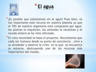 El documento describe la importancia del agua para la vida en la Tierra. El agua es esencial para los seres humanos, las plantas y los animales. Se compone de dos átomos de hidrógeno y uno de oxígeno. El ciclo del agua incluye la evaporación desde los océanos y ríos hacia las nubes, la condensación y la lluvia que devuelve el agua a la Tierra. El documento también recomienda formas de usar el agua de manera más eficiente para ayudar a conservar este valioso recur