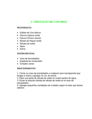 Este documento contiene 14 procedimientos para realizar diferentes proyectos y experimentos, incluyendo la fabricación de cristales de colores, gel para el cabello, cera emulsionante, lápiz hemostático, acetileno, biogás, plastilina, mermelada vitaminica, crema para afeitar, limpiador de platería, jabón multi-usos, pestañina, jabón de baño, y queso. Los procedimientos incluyen listas de materiales e instrucciones detalladas.