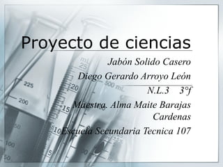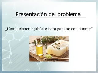 Este documento describe un proyecto de ciencias sobre cómo elaborar jabón casero para no contaminar. Explica que los jabones son sales de ácidos grasos producidas por una reacción química entre la grasa y la sosa. Detalla los materiales, procedimiento y conclusiones de un experimento para hacer jabón exfoliante casero con avena. El estudiante aprendió a elaborar jabones de forma sencilla y que los jabones exfoliantes sirven para limpiar la piel y dejarla más suave.