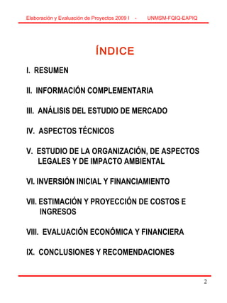 Este documento describe un proyecto de planta de reciclado de botellas de plástico PET en Perú. El proyecto tiene como objetivo producir hojuelas de PET de alta calidad a partir de botellas de plástico usadas para abastecer a las industrias manufactureras locales e internacionales. El documento analiza aspectos técnicos, legales, financieros y de mercado del proyecto. Se concluye que el reciclado de PET es técnicamente factible y beneficioso para el medio ambiente, y que existe una dem