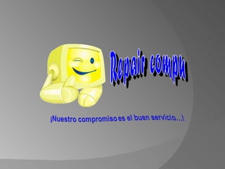 El documento presenta un proyecto de empresa llamada Repair Compu dedicada al mantenimiento de computadores. El proyecto justifica la necesidad del servicio debido a la falta de opciones que ofrezcan facilidades de crédito. La misión es prestar un servicio de calidad a precios asequibles con garantía. Los costos iniciales ascienden a $19.150.000 y se requiere financiamiento. La empresa ofrecerá mantenimiento preventivo, instalación, soporte técnico y venta de productos.