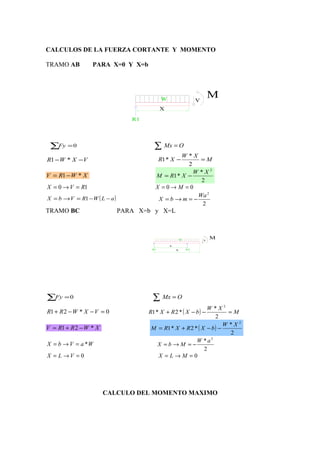 Este documento presenta cálculos para analizar la resistencia de materiales de una viga sometida a cargas. Calcula las reacciones, fuerzas cortantes, momentos flectores y esfuerzos máximos. También determina la deformación de la viga usando el método de la doble integral y el área de momento.