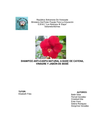 Este documento presenta un proyecto de investigación cuyo objetivo es elaborar un shampoo anti-caspa natural a base de cayena, vinagre y jabón de bebé. El proyecto es realizado por estudiantes de la Escuela Básica Nacional Concentrada "Los Rastrojos III Etapa" y busca desarrollar un producto accesible y económico para combatir la caspa. El shampoo se elaborará utilizando ingredientes disponibles localmente y de manera sencilla. El proyecto incluye la revisión de antecedentes