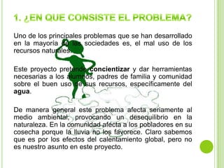Este proyecto busca crear conciencia sobre el buen uso y cuidado del agua entre alumnos, padres y la comunidad. Sus objetivos incluyen educar a la gente sobre la importancia del agua mediante presentaciones y videos, realizar campañas para promover su cuidado, limpiar ríos contaminados y reutilizar el agua. El proyecto tendrá tres etapas - educación, acción y prevención - y busca mejorar la calidad de vida de los participantes y aumentar su conciencia ecológica a través del trabajo colaborativo
