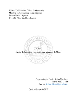 Este documento presenta un proyecto para abrir un centro de servicios y suministro de repuestos para motocicletas en Guatemala. Describe la oportunidad de negocio debido al crecimiento constante en el número de motocicletas en el país. Incluye la misión, visión y objetivos del proyecto, así como un análisis de la competencia, costos de apertura, viabilidad y sostenibilidad del centro de servicios propuesto. El autor concluye que existe una oportunidad para ofrecer un servicio de mayor confianza