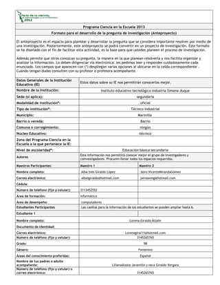 Este documento presenta un formato para desarrollar una pregunta de investigación como parte del Programa Ciencia en la Escuela 2013. El formato solicita información general sobre la institución educativa, los maestros y estudiantes participantes, y detalles sobre el título, área temática, categoría, modalidad, palabras clave, preguntas iniciales, pregunta de investigación, justificación, antecedentes, objetivos, metodología y presentación del proyecto. El propósito es facilitar el desarrollo del anteproyecto y su posterior conversión en un pro