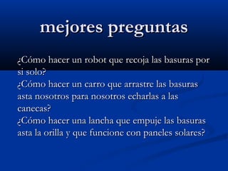 Este documento presenta un proyecto de un grupo de estudiantes para crear un invento que facilite el doblado de la ropa utilizando materiales reciclables como cartón. El invento consistirá en un marco hecho de varias piezas de cartón pegadas juntas que mantendrán la ropa estirada mientras se dobla. El objetivo es ayudar a quienes no saben doblar ropa fácilmente y aprovechar materiales que de otro modo se desecharían.