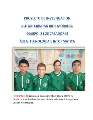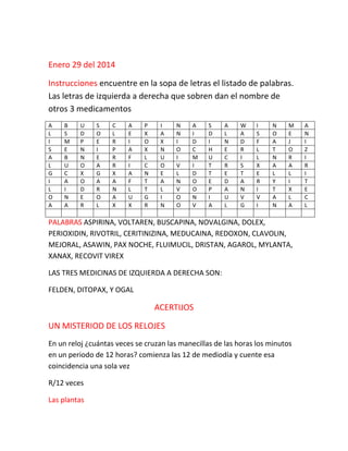 Este documento contiene varias secciones, incluyendo una lista de palabras en una sopa de letras, acertijos con respuestas, un informe de video sobre decisiones poderosas, un decálogo, y varias preguntas de investigación propuestas con sus respuestas.
