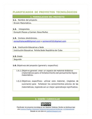 Este documento presenta un planificador de proyectos tecnológicos para el proyecto "Rincón Matemático" creado por dos estudiantes. El proyecto busca crear material didáctico matemático utilizando regletas de cuisinaire para fortalecer conocimientos matemáticos. El planificador incluye la formulación del proyecto, diseño curricular, metodología, evaluación y uso de TIC.
