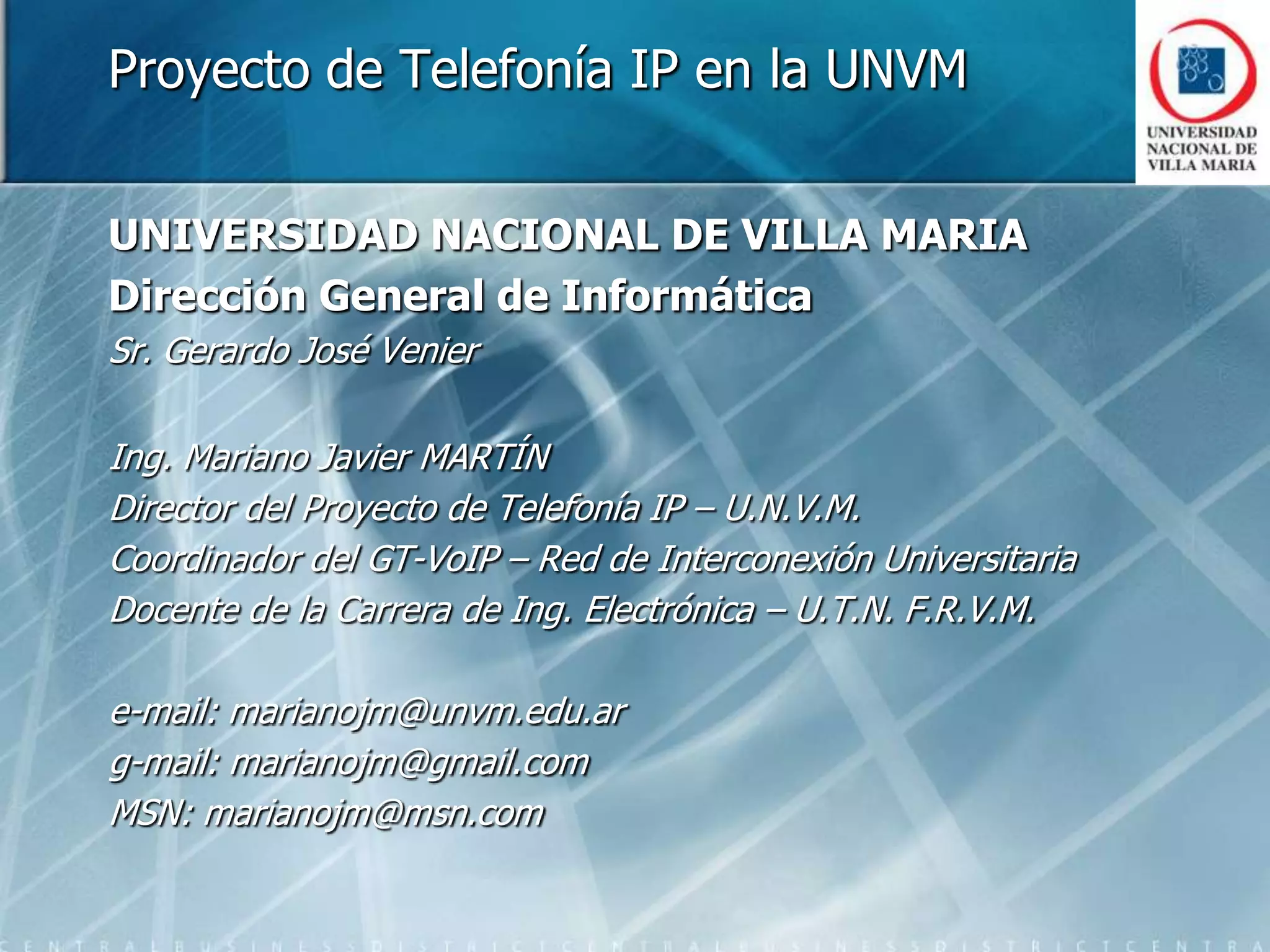 El proyecto de telefonía IP en la Universidad Nacional de Villa María se inició en 2006 con pruebas y se ha expandido para interconectar diversas sedes, implementando tecnologías avanzadas para mejorar la comunicación y reducir costos. La iniciativa busca transformar la red de telefonía convencional en una red IP, facilitando la comunicación interna y ofreciendo nuevos servicios mientras minimiza el impacto en los usuarios. Se destaca la importancia de la administración adecuada de las TIC y la concientización sobre las ventajas de la telefonía IP frente a la tecnología tradicional.