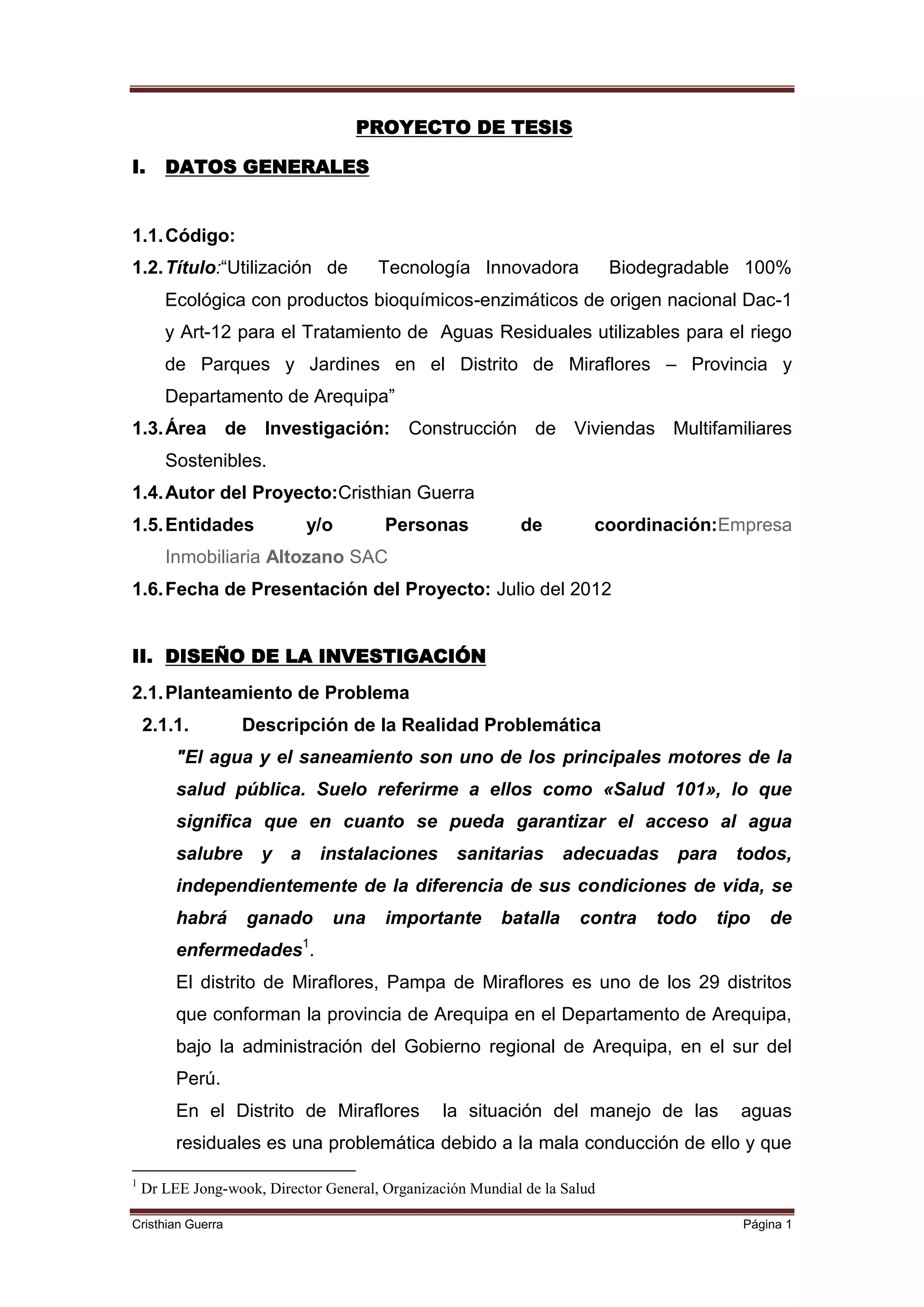 Este documento presenta un proyecto de tesis sobre el tratamiento de aguas residuales en el distrito de Miraflores en Arequipa, Perú. El proyecto propone utilizar una tecnología innovadora y biodegradable llamada DAC-1 y ART-12 para tratar las aguas residuales domésticas de 13 edificios multifamiliares y usar el agua tratada para regar parques y jardines. El proyecto justifica esta solución para minimizar los impactos ambientales negativos de la contaminación del agua y mejorar la calidad de