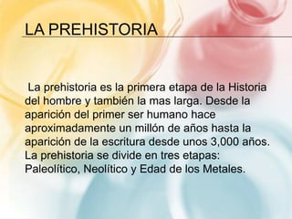 La prehistoria abarca desde la aparición del primer ser humano hace aproximadamente un millón de años hasta la aparición de la escritura hace unos 3,000 años. Se divide en tres etapas: Paleolítico, Neolítico y Edad de los Metales. En el Paleolítico, los primeros humanos eran cazadores y recolectores que vivían en cavernas y fabricaban sus propias herramientas de piedra y hueso.