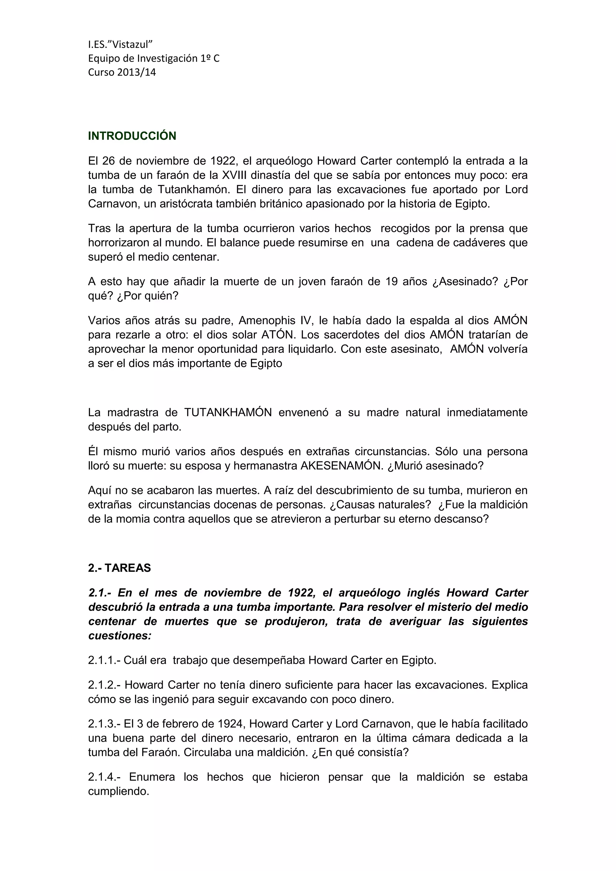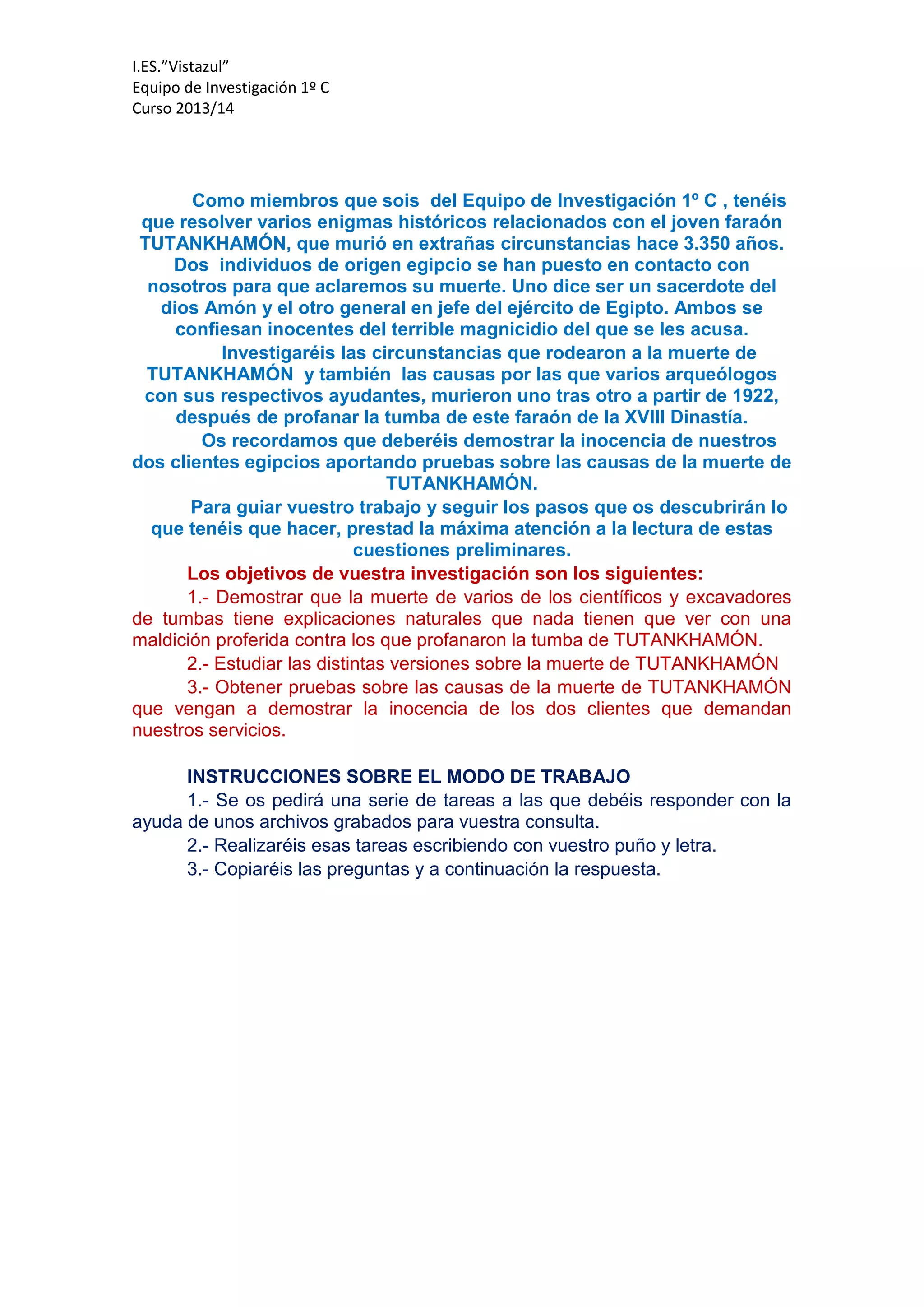 Este documento presenta un proyecto de investigación sobre las circunstancias de la muerte del faraón Tutankhamón. Los estudiantes deberán investigar las causas de su muerte y demostrar la inocencia de dos clientes egipcios acusados del asesinato. También deberán explicar las muertes de arqueólogos después del descubrimiento de la tumba. El documento proporciona instrucciones y preguntas para guiar la investigación a través de varios archivos.