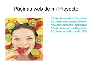 Este documento presenta un proyecto sobre la Pirámide de los Alimentos con el objetivo de enseñar a los estudiantes sobre una alimentación saludable. Incluye enlaces a páginas web sobre nutrición y la pirámide alimenticia, así como un plan del proyecto y una evaluación sobre un debate de clase acerca de la alimentación. El debate propone combatir el problema de la obesidad enseñando a los niños sobre alimentación saludable en la escuela a través de dos sesiones de una hora cada una.