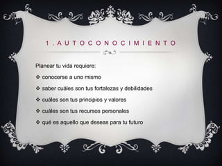 El documento describe los pasos para elaborar un proyecto de vida, incluyendo el autoconocimiento, la formulación de una misión personal y objetivos, y la consideración de factores internos y externos. El propósito es ayudar al lector a planificar su vida de manera consciente y alcanzar su máximo potencial.