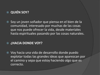 Carlos Mauricio Toro es un joven soñador que desea desarrollarse para explotar sus ideas y hacer el bien. Su visión es ser una persona productiva, honesta y útil para la sociedad. Planea estudiar ingeniería mecánica para tener éxito en su carrera y ayudar a los demás.