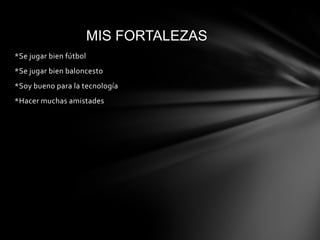 El documento presenta la historia, fortalezas, debilidades, metas a corto, mediano y largo plazo de Santiago Niño Carreño. Sus fortalezas incluyen jugar fútbol y baloncesto y ser bueno con la tecnología y hacer amigos, mientras que sus debilidades son ser agresivo, impaciente y perezoso. Sus metas a corto plazo son aprobar todas sus materias y ganar una competencia de emprendimiento, a mediano plazo graduarse con honores de la escuela y entrar a una buena universidad para ser