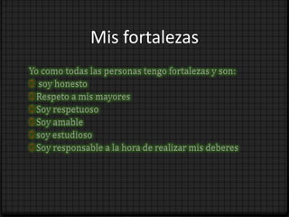 El documento describe las debilidades del autor como ser desordenado, irrespetuoso con sus padres y profesores, y perezoso. También detalla su historia de nacimiento en Medellín y su educación en un colegio donde ha tenido una experiencia maravillosa. Sus metas son estudiar negocios internacionales y derecho para convertirse en un embajador, ganar el año escolar con buenas calificaciones, y entrar a una gran universidad.