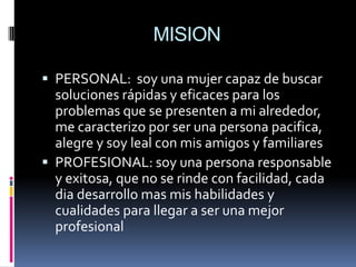 Este documento presenta el proyecto de vida de Marisol Dayana Vizcaíno Guerrero. Describe su misión y visión personal y profesional, que incluyen metas como terminar el bachillerato, estudiar una carrera universitaria y tener una familia y trabajo estable. También detalla aspectos de su vida personal como su familia, logros educativos, deseos y cosas positivas que ofrece.