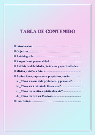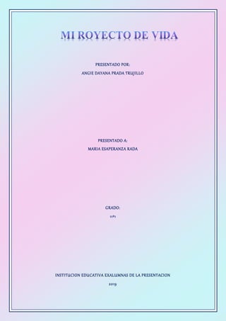 Este documento presenta el proyecto de vida de Angie Dayana Prada Trujillo, una estudiante de 11o grado. Incluye una introducción, objetivos, autobiografía, análisis de fortalezas y debilidades, y aspiraciones para el futuro personal y profesional en los próximos 15 años. El proyecto tiene como misión crecer intelectual y moralmente, estudiar una carrera universitaria como ingeniería industrial, y formar un hogar con una familia propia.