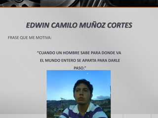Este documento presenta el proyecto de vida de Edwin Camilo Muñoz Cortes. Describe sus metas a corto, mediano y largo plazo, las cuales incluyen terminar su técnico en sistemas, estudiar ingeniería de sistemas, crear su propia empresa, y ayudar a niños necesitados. También detalla sus fortalezas como la perseverancia y responsabilidad, así como sus debilidades como la timidez. El documento resalta la influencia positiva de sus padres y maestros en su vida.