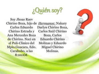Este documento presenta el proyecto de vida de Jhoas R. Chirino B., un estudiante venezolano. Resume su familia, fortalezas como su responsabilidad y debilidades como el miedo a fracasar. Su visión es convertirse en un reconocido arquitecto mundial graduándose con honores de la Universidad de Harvard. Su misión es estudiar para cumplir sus sueños y construir edificios famosos. Sus metas a corto plazo son graduarse de bachiller y esforzarse académicamente, y a larg