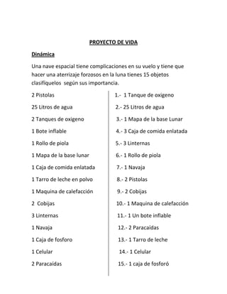 Este documento clasifica 15 objetos de importancia para sobrevivir después de un aterrizaje forzoso en la luna. El tanque de oxígeno y el agua son los más importantes, seguidos por un mapa de la base lunar, comida enlatada y linternas.